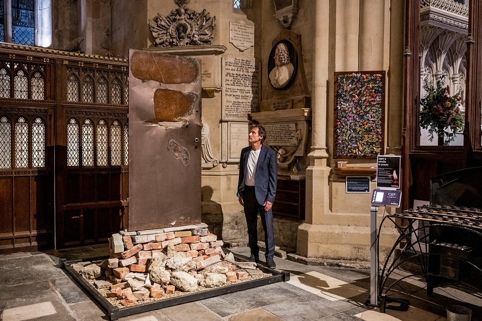 Standing within the Abbey’s St Alphege Chapel, Collateral Damage confronts visitors with the brutal realities of war and the resilience of the human spirit. Created by artist Robert Marshall, this striking installation features a bomb-damaged door salvaged from a destroyed home in Ukraine – a simple yet devastating symbol of lives and communities torn apart.